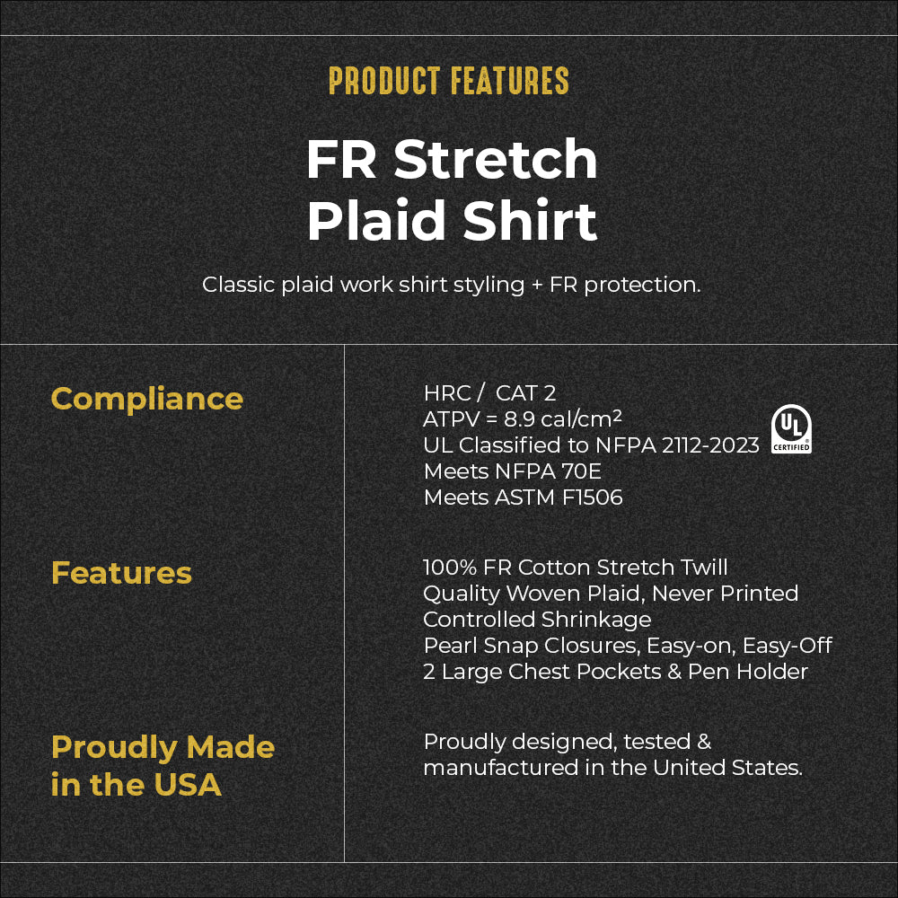 Just like your favorite plaid shirt, in performance stretch FR Cotton. A blend of Cotton, Nylon and Spandex means the shirt flexes with you and won't constrict movement. Slight brushed face makes if feel extra soft, but durable Nylon means excellent wear & tear.