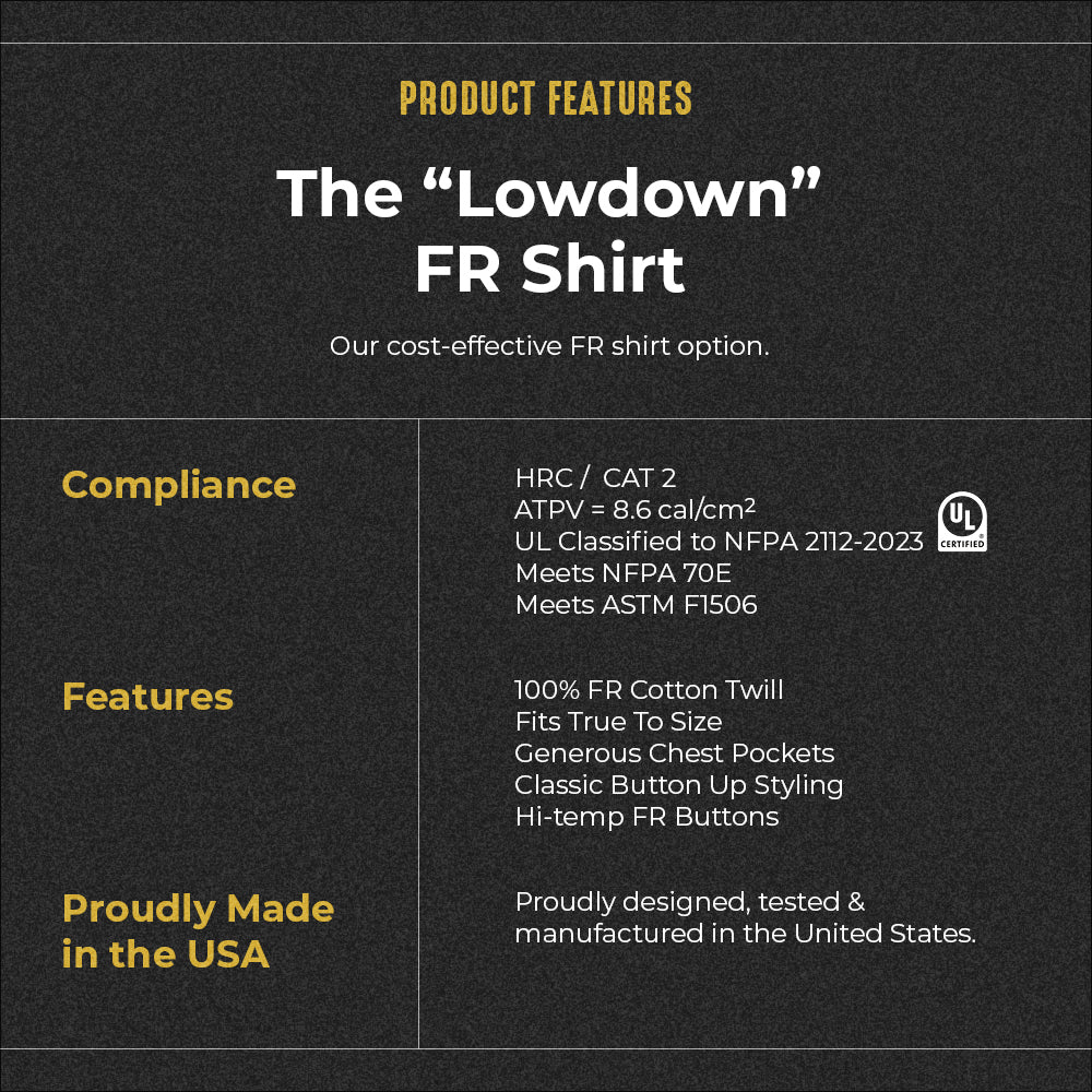 Superior colorfastness and is flame resistant for life regardless of how many times you wash and wear it. While the USA made "Lowdown" costs a little less, it will be more comfortable and outlast any competitors' imported shirts. You get a far superior product, a warranty and US craftsmanship for a great price.
